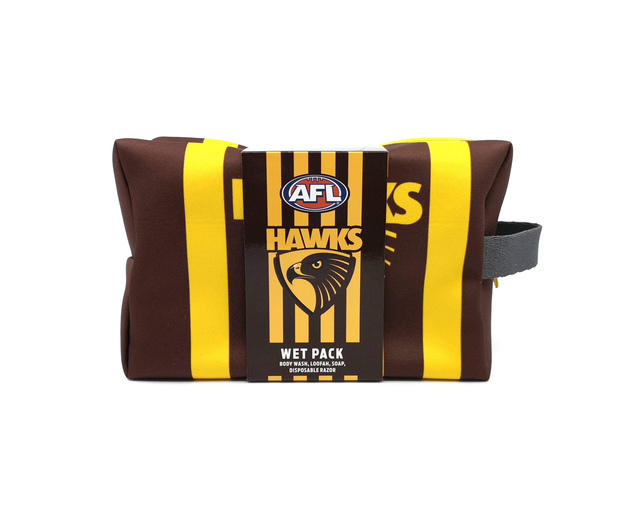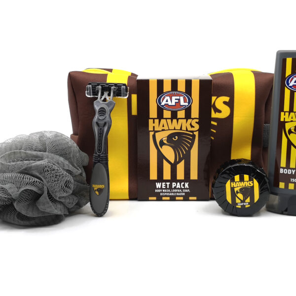 AFL WET PACK GIFT SET HAWTHORN WET PACKS IN A ZIPPED NEOPRENE BAG, CONTAIN: 150ML BODY WASH (TEAM BRANDED), DISPOSABLE RAZOR (TEAM BRANDED), 50 GRM SOAP (TEAM BRANDED), LOOFA.