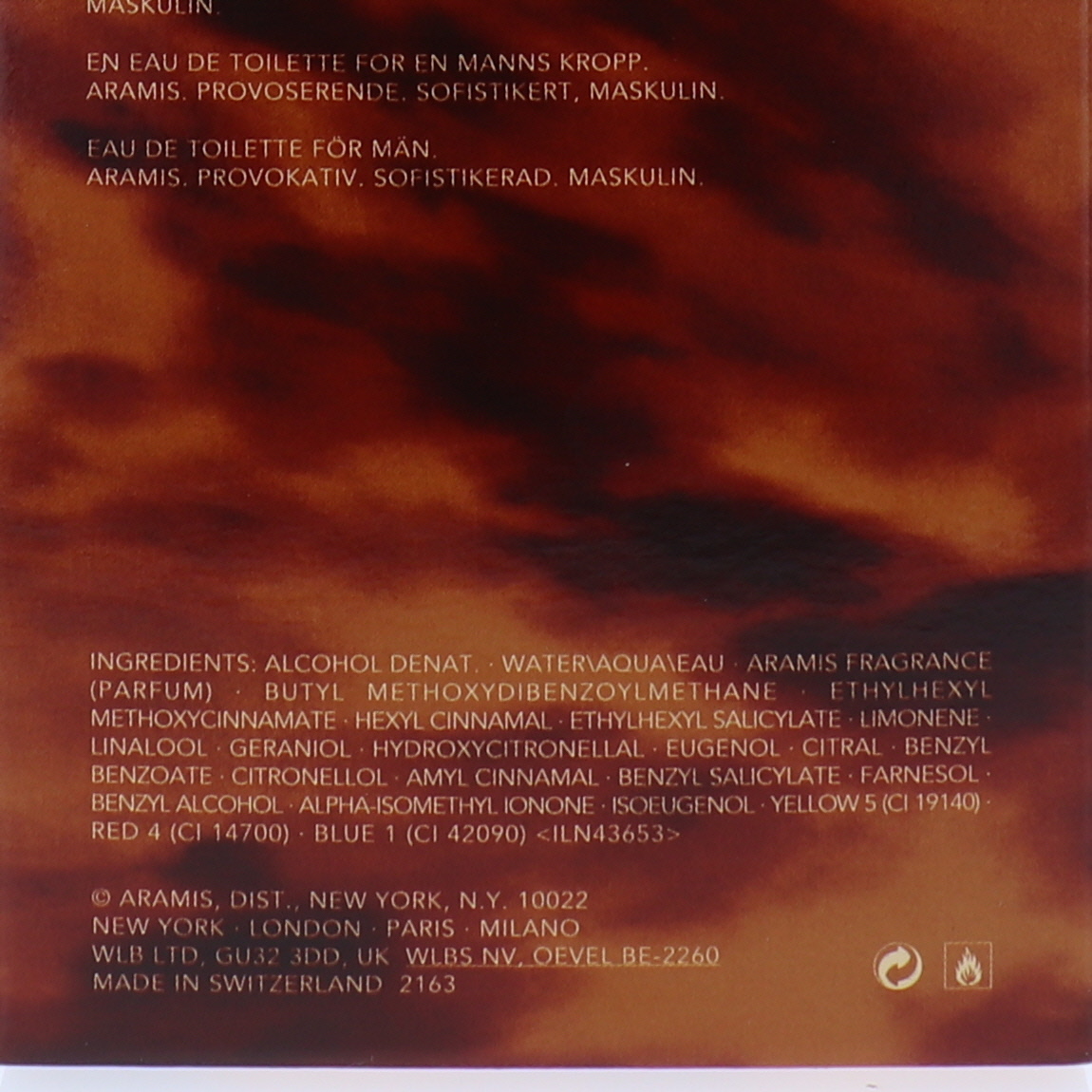 | Ingredients | Alcohol Denat., Alpha-Isomethyl Ionone, Amyl Cinnamal, Aramis Fragrance (Parfum), Benzyl Alcohol, Benzyl Benzoate, Benzyl Salicylate, Blue 1 (Ci 42090), Butyl Methoxydibenzoylmethane, CITRAL, Citronellol, ETHYLHEXYL METHOXYCINNAMATE, Ethylhexyl Salicylate, Eugenol, FARNESOL, Geraniol, Hexyl Cinnamal, Hydroxycitronellal, ISOEUGENOL, LIMONENE, Linalool, Red 4 (Ci 14700), WATER/AQUA/EAU, Yellow 5 (CI 19140) |